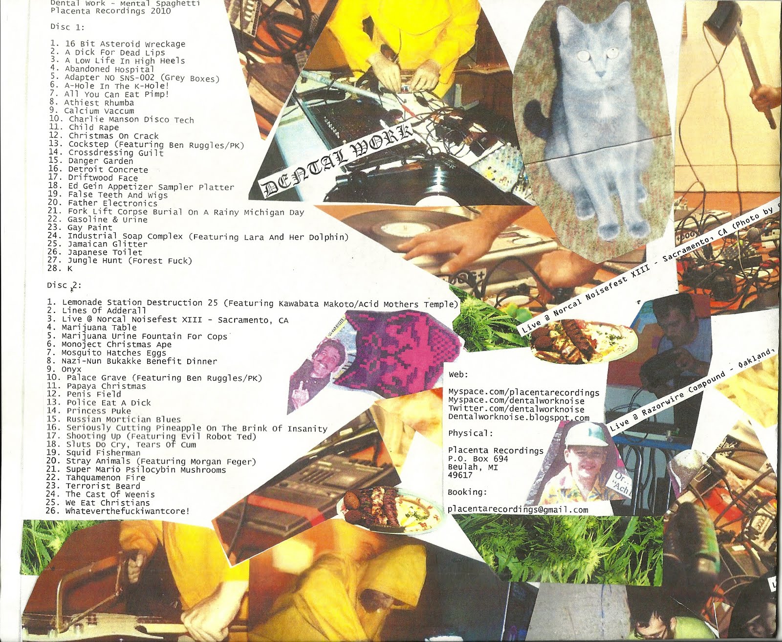 "Anxiety.Addiction.Abuse. is a groundbreaking album by your favorite creator of un-easy listening: Dental Work. 8 tracks of extreme piercing power electronics, teeth grinding harsh noise, psychedelic walls of experimentalism, and disturbing art work, all set to the tone of something strange and uncomfortable. Self released on Placenta Recordings, 2009. Limited Edition Of 200 High Quality CD-R copies w/art and obcure packaging - and only 5 bucks!"