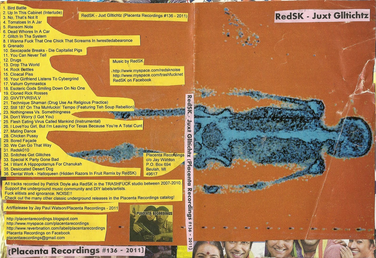 36 broken glitches of culture by Detroit, MI’s most hated on noise artist Patrick Doyle aka RedSK. Recorded between 2007-2010 in TRASHFUCK studio, with extreme/awesome titles like “Snitches Get Glitches”, “Special K Party Gone Bad”, and even a remix of Dental Work’s “Halloqueen”. This is a must have for all fans of Noise, Breakcore, Glitch, Drugs, Sex, RedSK, Trashfuck, and Placenta Recordings. Art by Jay Watson.